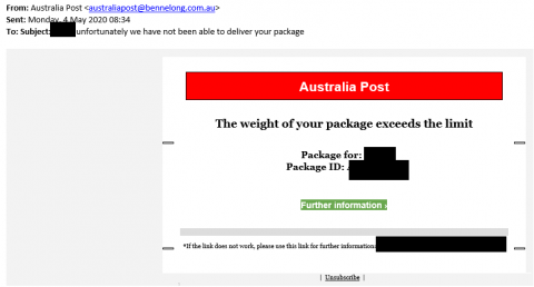 Recently, Australia Post has made people aware of fraudulent emails being sent using their branding and prompting customers to click on a link. The emails incorrectly claim a package has failed to be delivered and includes a link to click to ‘Pay fee’ or seek ‘Further information.’